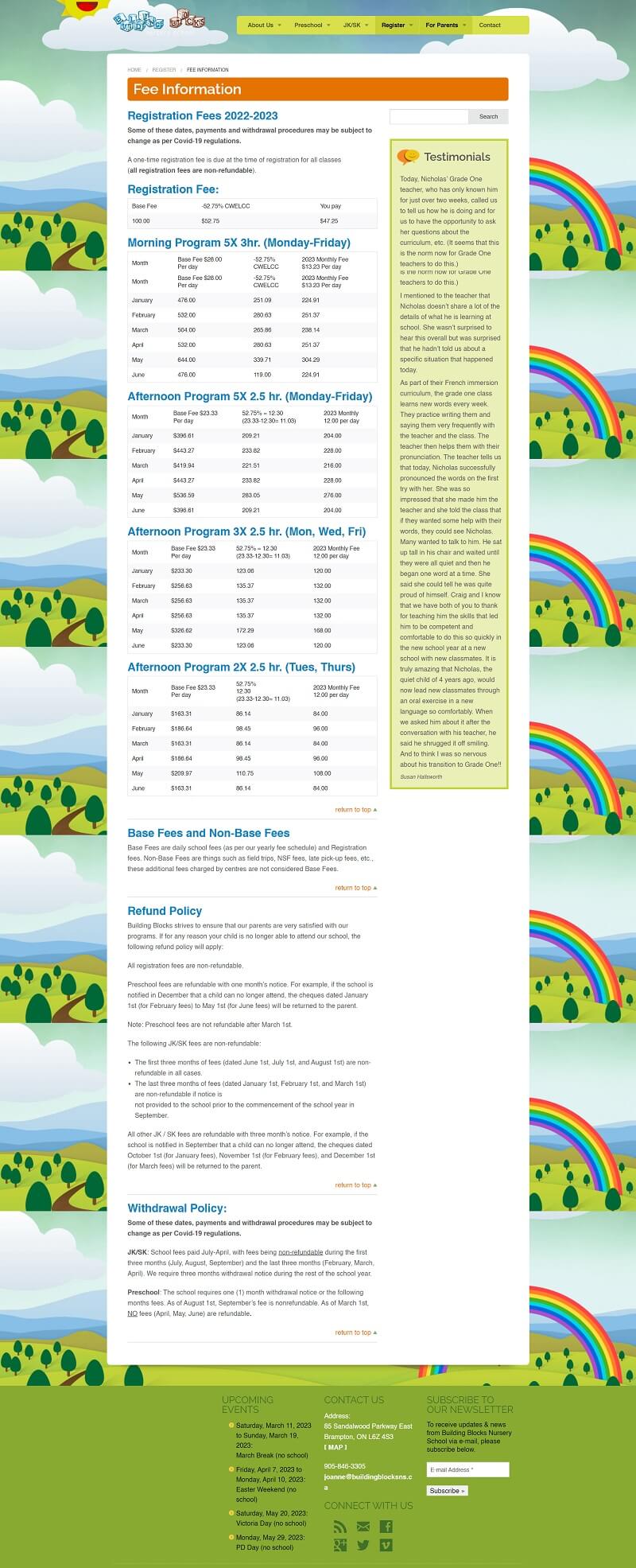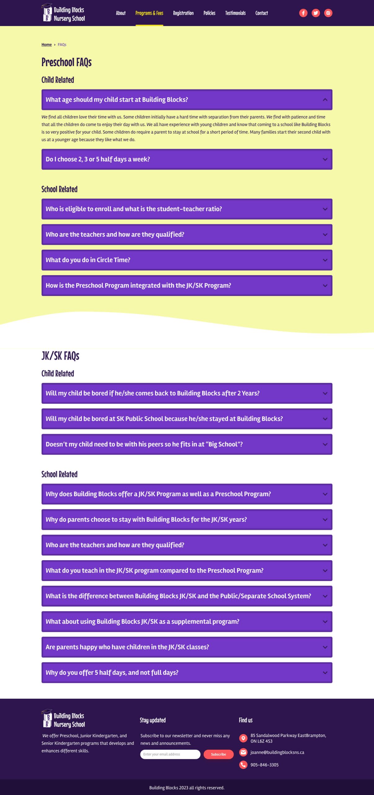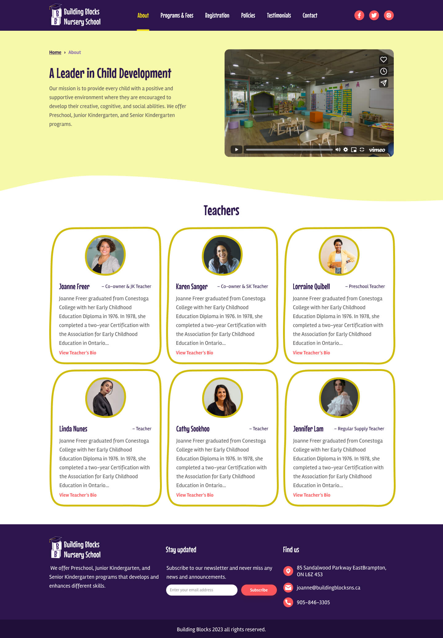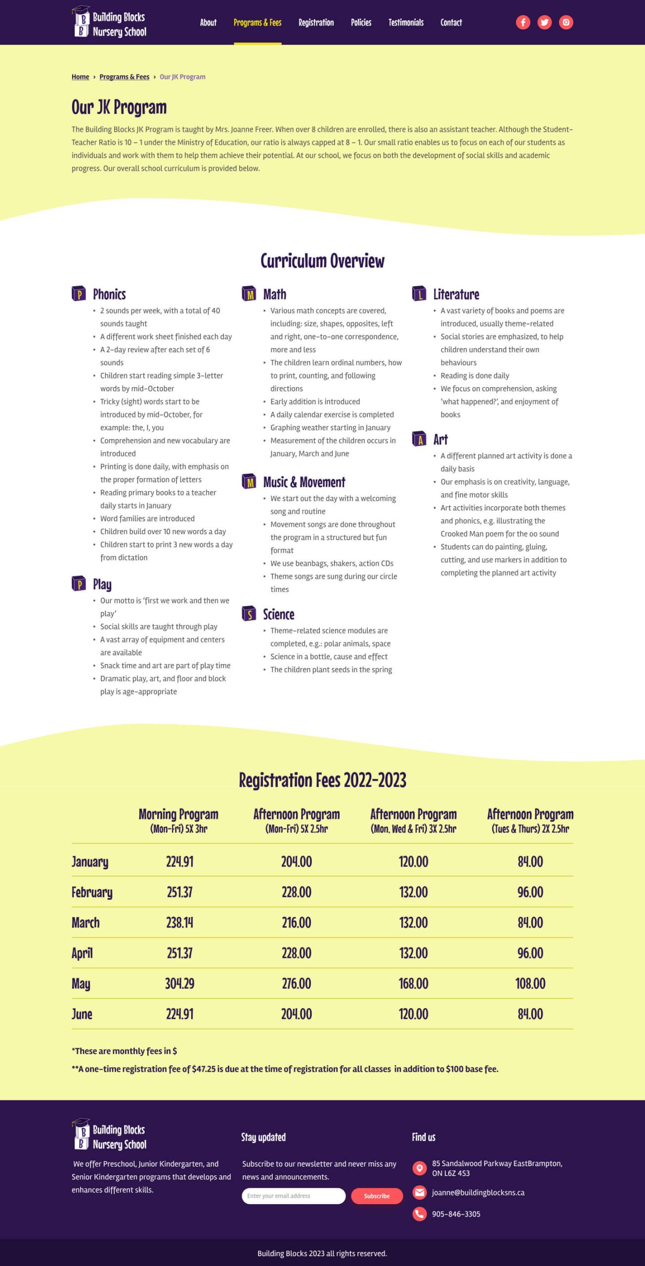 The homepage now highlights the important sections of the website, the programs and details about the school are listed. I added a testimonial section to the homepage instead of the testimonials being added to the side of each page on the current website. I also added a section for the latest news with tabs to filter the news based on the topic. On the about page, I added stock photos for each teacher because the current photos are old, and these are to be replaced with new real photos. I designed a page for each program that includes all of its details, curriculum and fees instead of having two separate pages for the program and fees as on the current website.