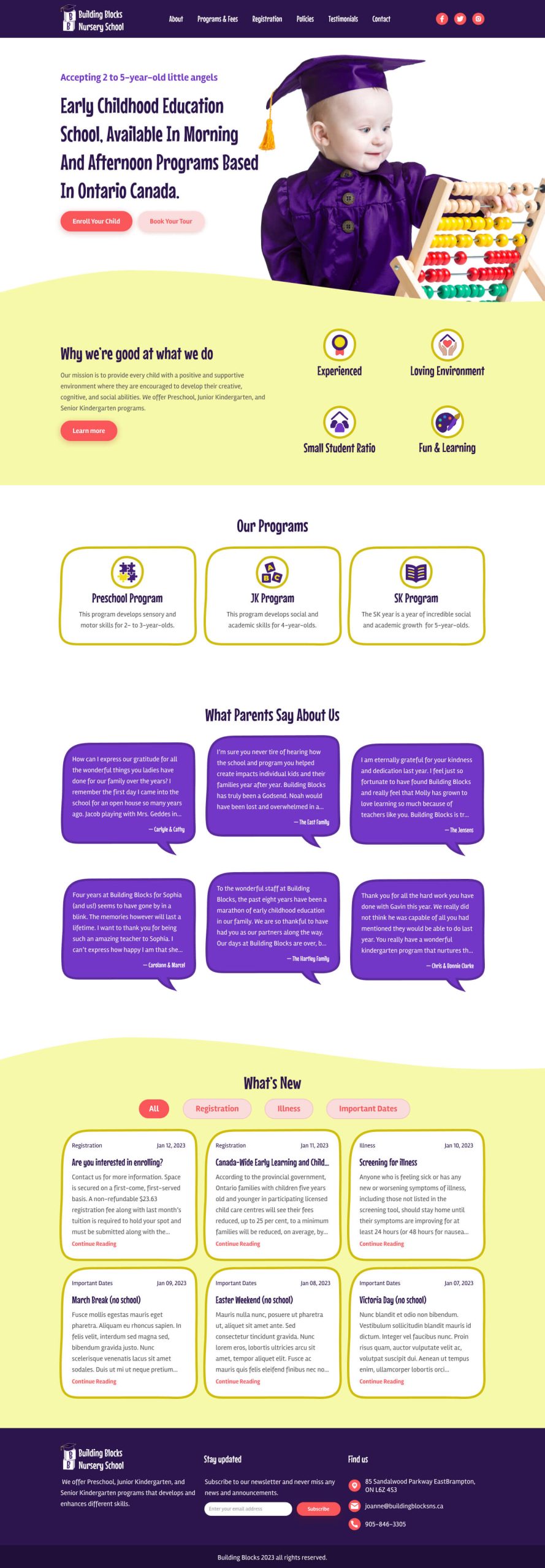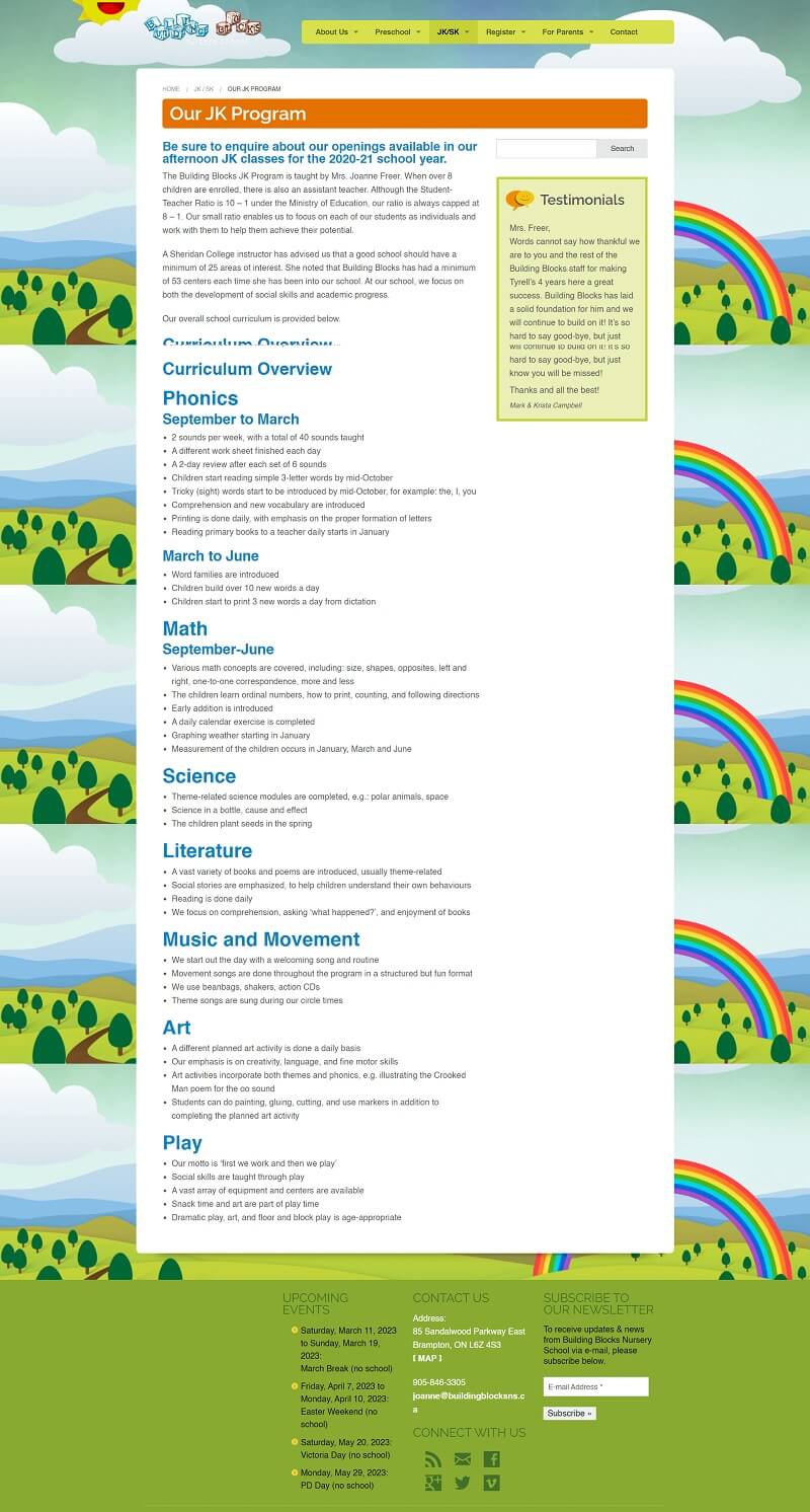 Building Blocks is a nursery school that is based in Ontario, Canada. The current website has all the information that is needed by the user, but the way information is organized can be improved. Besides, I set out to solve some UI design issues and make the design more appealing to the eye. Note that this is a personal project and it was conducted to test a design concept, it is not a real project that is based on communication.