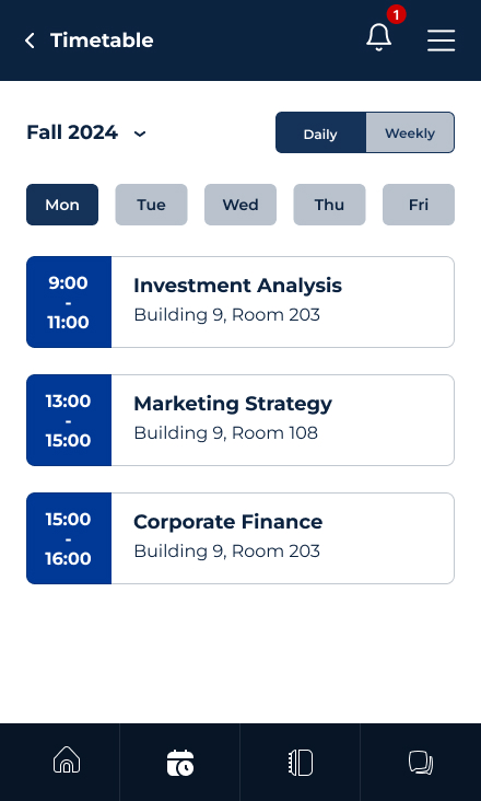 - Timetable: view the timetable in both calendar and list views.